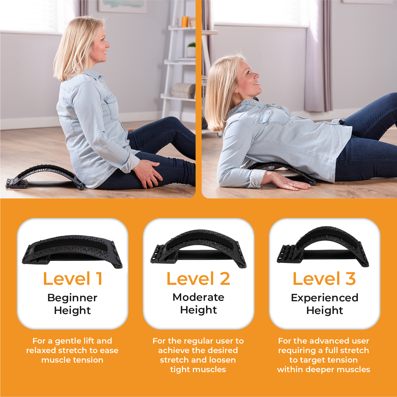 The Back Stretcher can be used at 3 different levels, allowing you to adjust the height to your desired stretch and comfort.