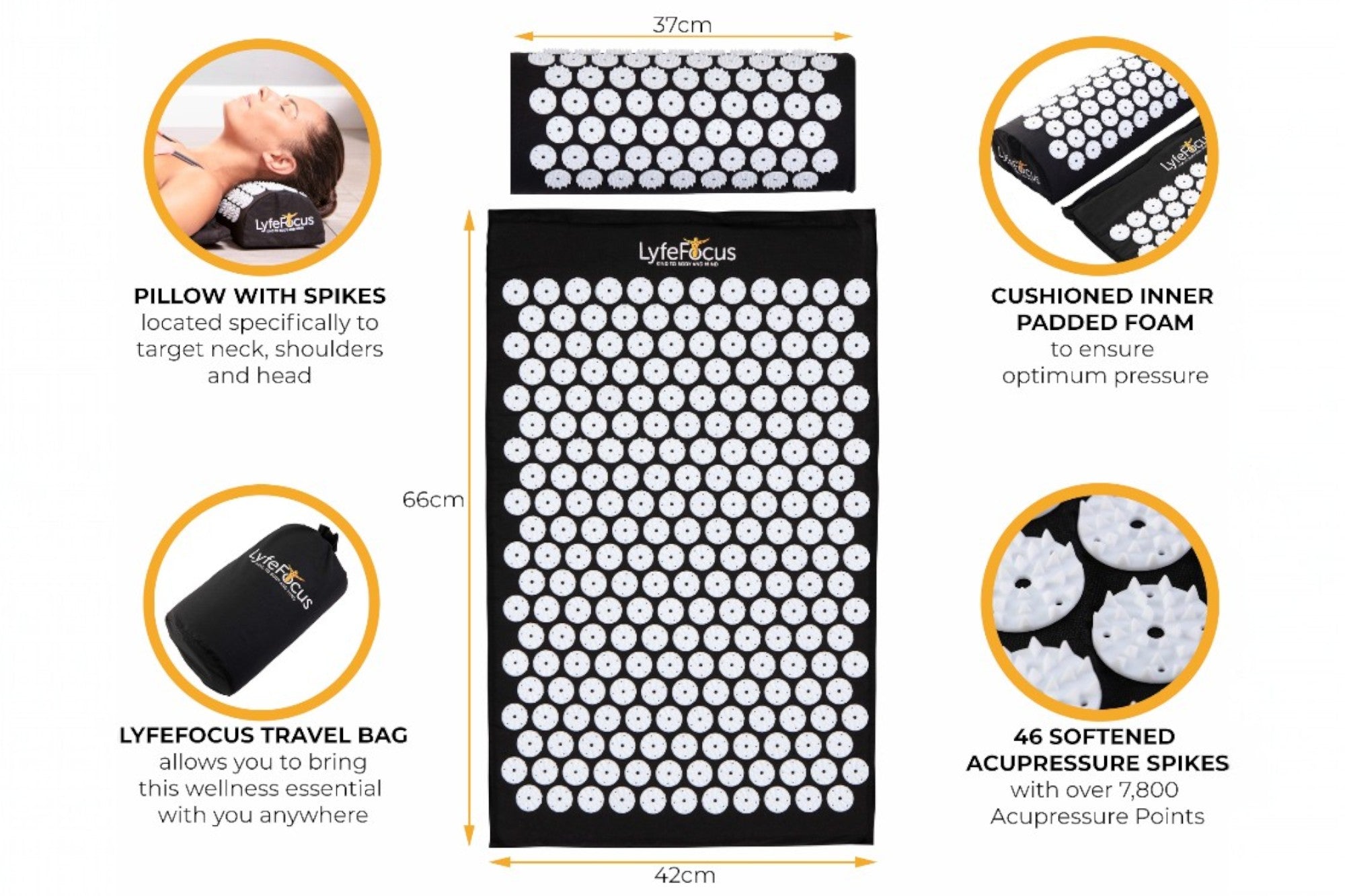 The Acupressure Mat and Pillow, also known as an acupuncture or shakti mat, has been designed with an optimal number of softened spikes that are specifically located to target the back, neck, shoulders and head at the same time.