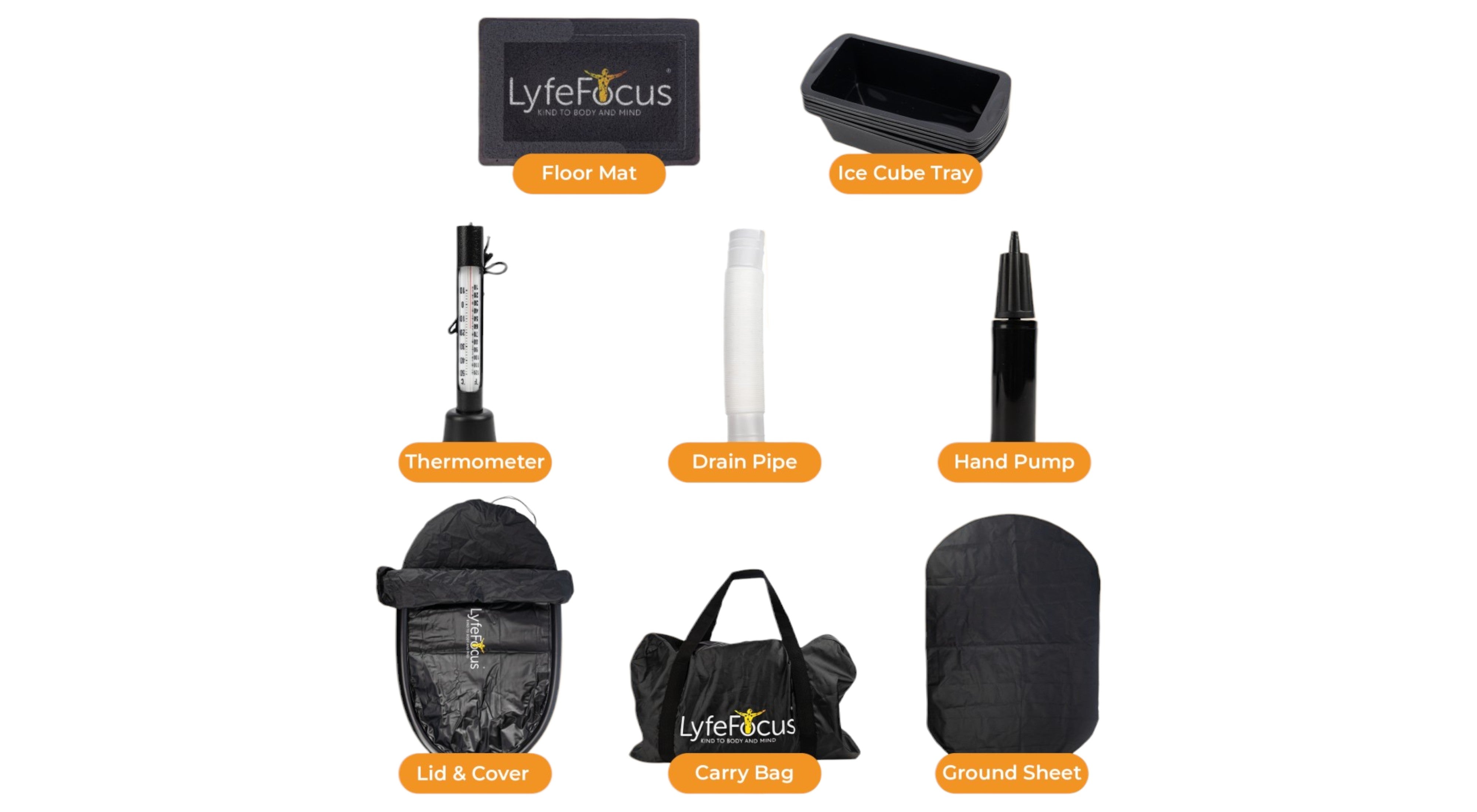 Included is a foot mat, groundsheet, pump, drain hose, ice cube trays, protection lid, attachable over cover, thermometer and travel bag... so you have everything you need to have an enjoyable and straight forward cold-water experience.